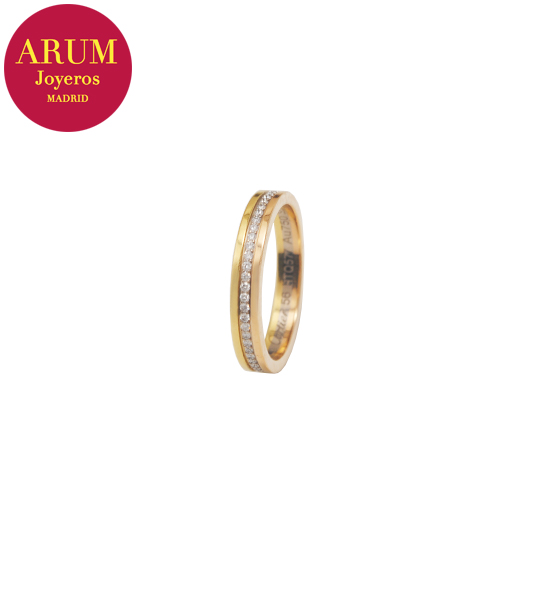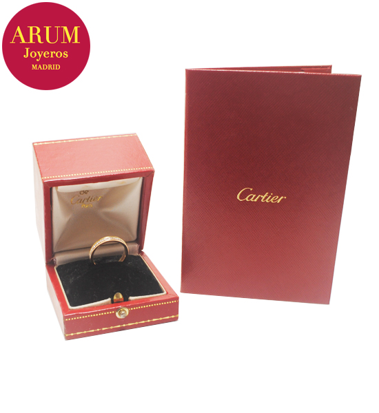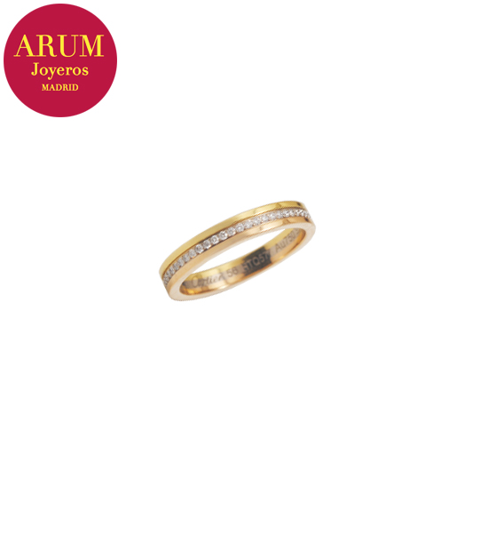 Description: Wedding ring from the prestigious Cartier jewellery company, made in 18 carat rose gold, 18 carat white gold and 18 carat yellow gold, set with 53 brilliant-cut diamonds totalling 0.23 carats. Width: 3.5 mm.