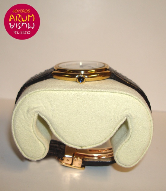 Description :yellow gold, white dial with roman numbers, sapphire crystal, quartz movement, central second, blued steel hands, date at three, diameter 33 mm, black leather strap, pink gold folding clasp.