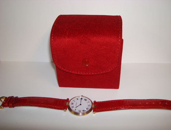 Description :3 bands (yellow gold, white gold and rose gold), quartz movement, 30mm diameter, crown with stone, red leather strap, yellow gold buckle closure.