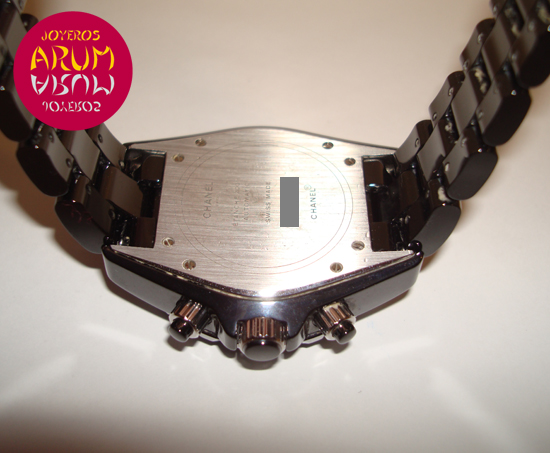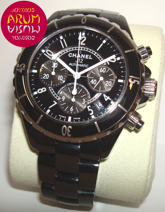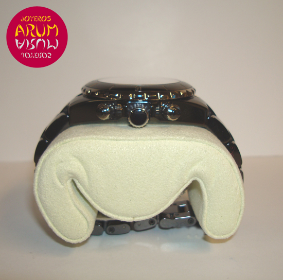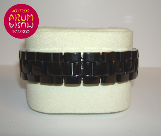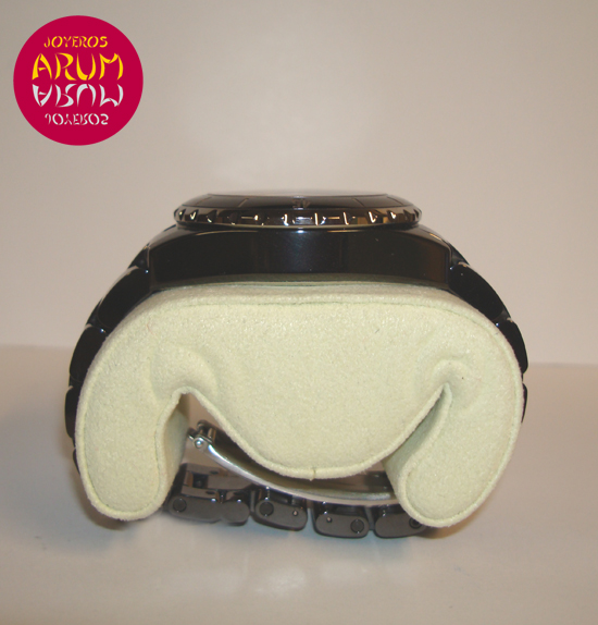Description :black ceramic, black dial, sapphire crystal, automatic movement, chronograph, three indicators on the dial, seconds, minutes, hours, date between four and five, handles and luminescent dial, screw crown and two buttons at right, diameter 41 mm, waterproof 200 meters, black ceramic strap, hidden folding clasp.