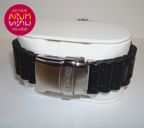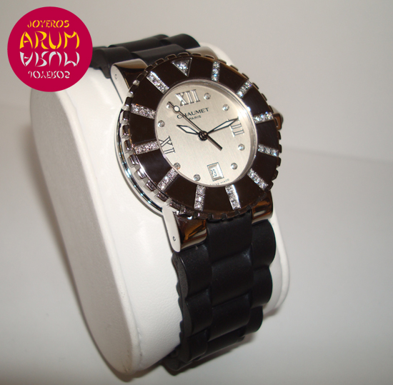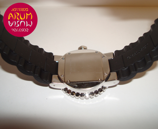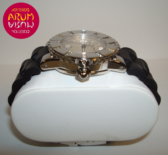 Description :steel, white dial, sapphire crystal, rotating bezel with diamonds, quartz movement, date at six o’clock, luminescent handles, center seconds, diamonds on the dial, diameter 32 mm, screw crown, waterproof 100 meters, rubber strap, folding clasp steel.