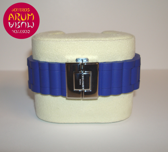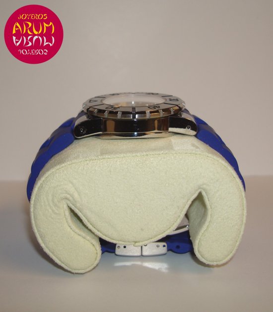 Description :steel, silver dial, sapphire crystal, rotating bezel, quartz movement, date at six, handles and luminescent dial, center seconds, 32.5 mm diameter, screw crown, waterproof 100 meters, blue rubber strap, steel folding clasp, year 2011.