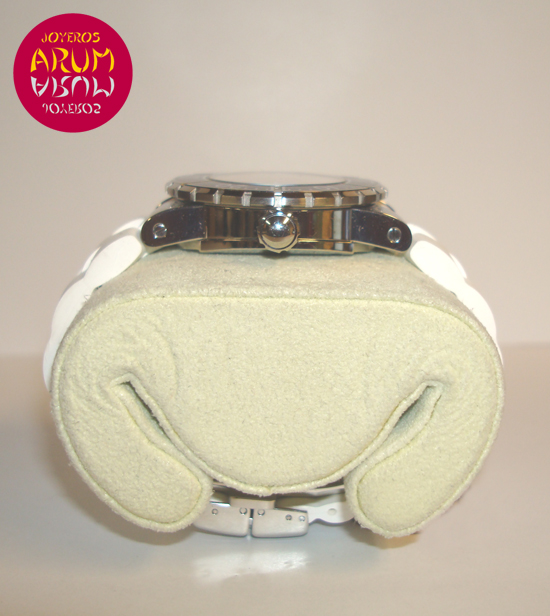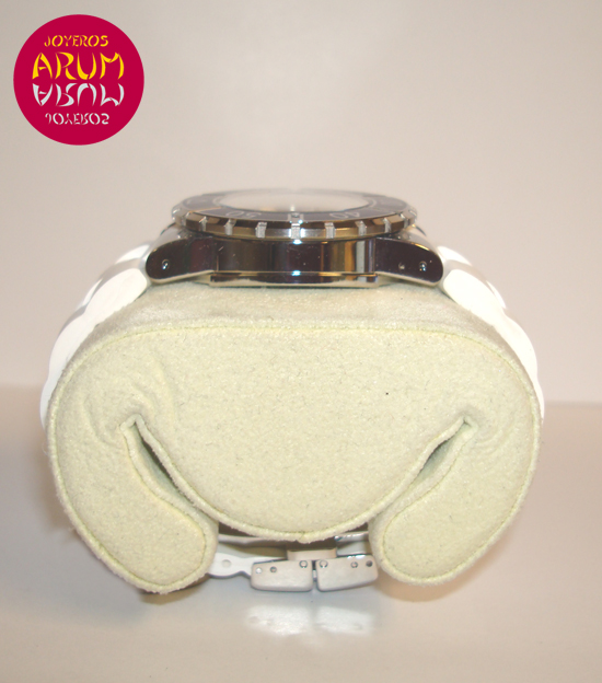 Description :steel, blue dial, sapphire crystal, rotating bezel, quartz movement, dial with brilliants, date at six, handles and luminescent dial, center seconds, 32.5 mm diameter, screw crown, waterproof 100 meters, white rubber strap, steel folding clasp.
