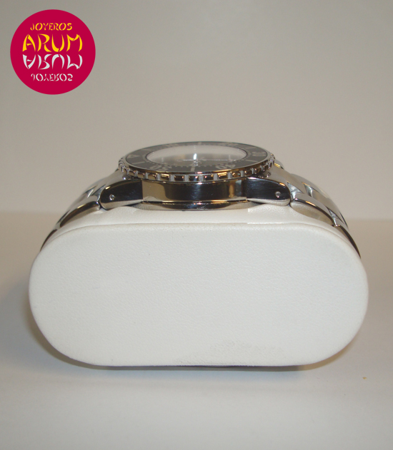 Description :lady’s watch, steel, dial with roman numbers, rotating bezel, sapphire crystal, quartz movement, center seconds, luminescent handles and dial, date at six, diameter 32.5 mm, waterproof 100 meters, steel bracelet, hidden folding clasp.