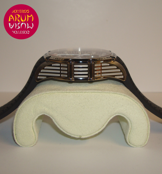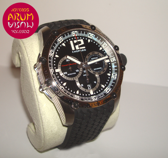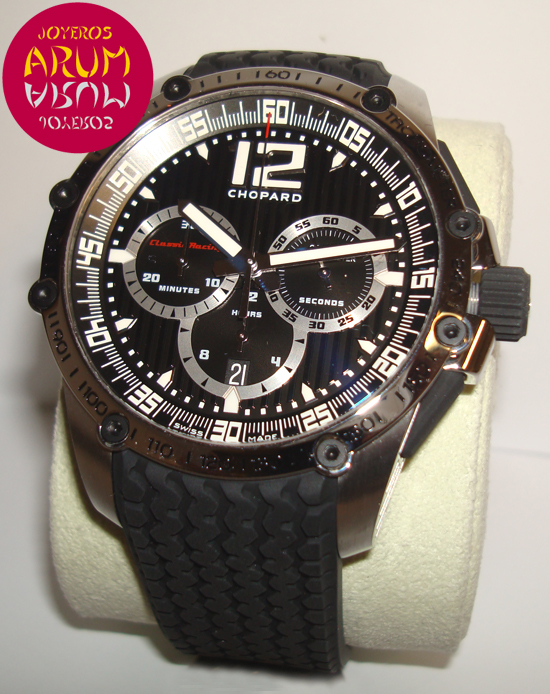 Description :steel, black dial, fixed bezel with tachymeter scale, sapphire crystal, automatic movement, power reserve 42 hours, chronograph, three indicators on the dial, seconds, minutes and hours, date at six, handles and luminescent dial, crown and two buttons at right, transparent caseback, diameter 45 mm, waterproof 100 meters, rubber strap, steel folding clasp.