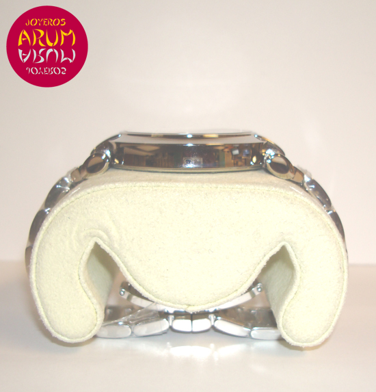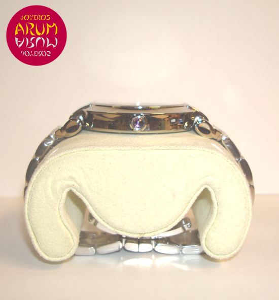 Description :steel, silver dial with roman numbers, smooth bezel, sapphire crystal, automatic movement, power reserve 42 hours, handles and dial with luminescent indicators, center seconds, date at three, crown decorated with amethyst, diameter 40 mm, waterproof 50 meters, steel strap, hidden folding clasp.