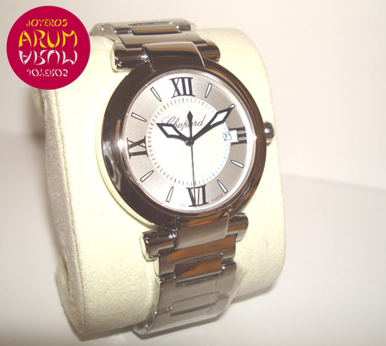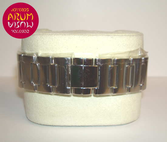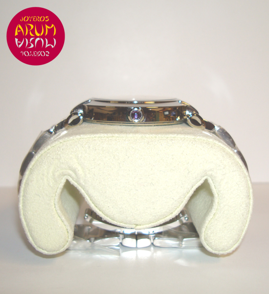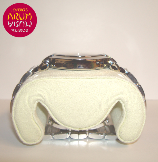 Description :steel, silver dial with roman numbers, smooth bezel, sapphire crystal, quartz movement, handles and dial with luminescent indicators, center seconds, date at three, crown decorated with amethyst, diameter 36 mm, waterproof 50 meters, steel strap, hidden folding clasp.