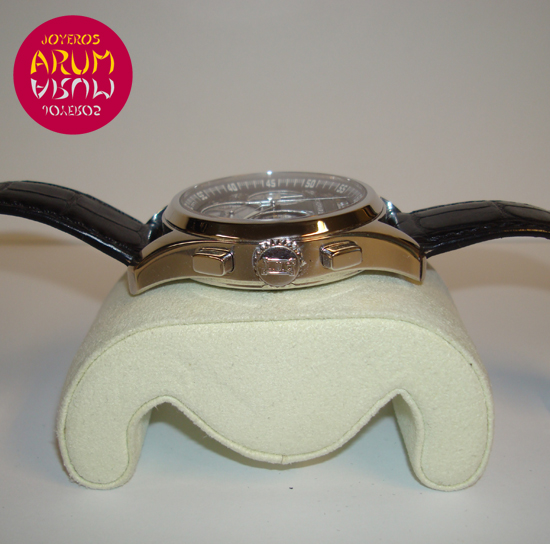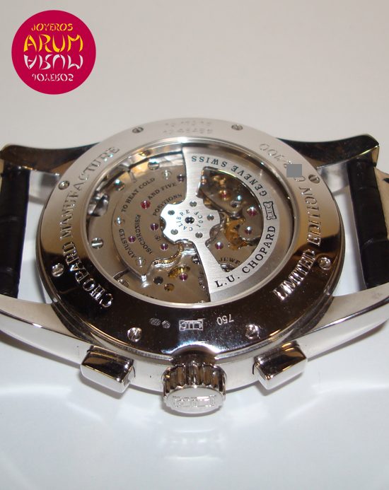 Description :limited edition of 100 pieces, white gold, automatic movement, tribute to the brand’s founder, Louis Ulysse Chopard, power reserve 60 hours, 45 ruby, 28,800 vibrations per hour, COSC certified, anti-reflective sapphire crystal, chronograph, hour indicador, minute indicator, independent small seconds, date at six, handles with luminescent indicators, crown and two buttons to the right, 41 mm diameter, transparent caseback with sapphire crystal, waterproof 50 meters, black leather strap, folding clasp in white gold, year 2008.