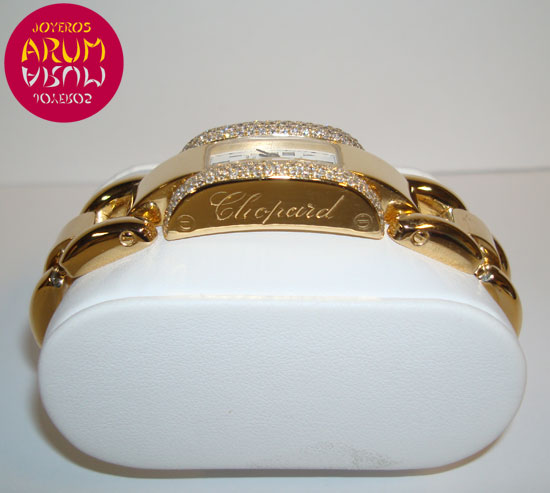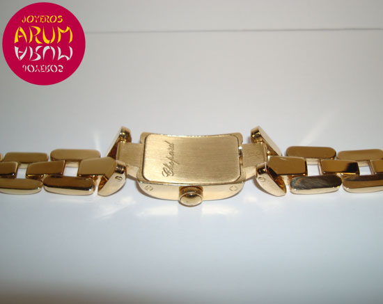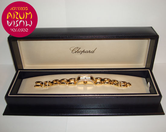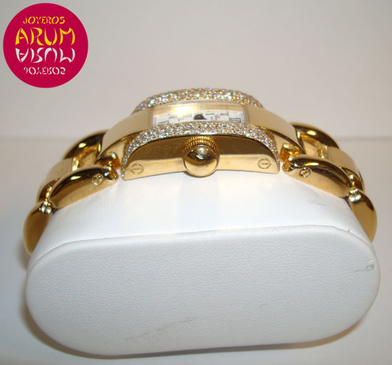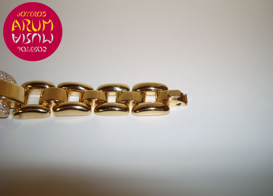 Description :lady watch, yellow gold, white dial with roman numerals, sapphire crystal, quartz movement, bezel with diamond pavé, screwed crown, diameter 18 mm, yellow gold strap.