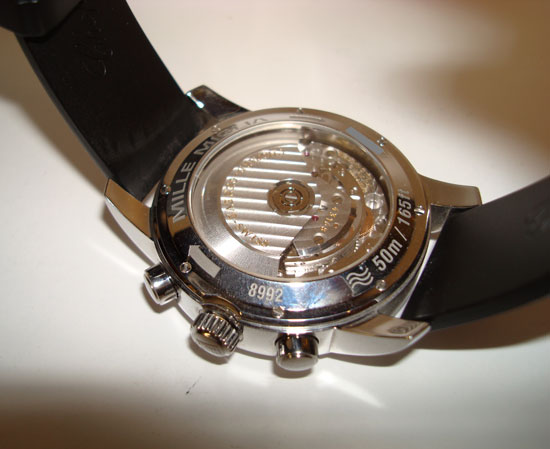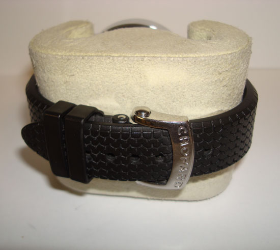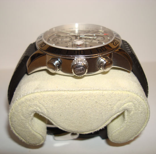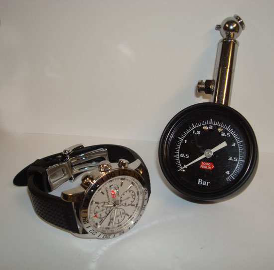 Description :steel, white dial, sapphire crystal, automatic movement, GMT function (handle that indicates a second time zone), chronograph, three indicators on the dial, seconds, minutes, hours, date at three, magnifier date, luminescent handles, 42 mm diameter, transparent caseback, screw crown and two buttons, 50 meters waterproof, rubber strap, steel folding clasp. The watch includes a instrument for measuring tire pressure.
