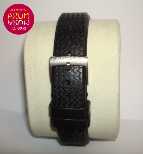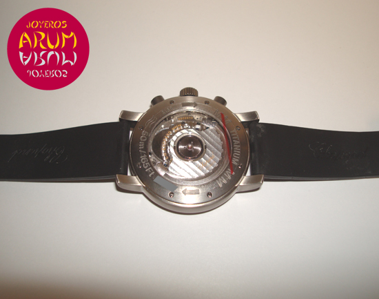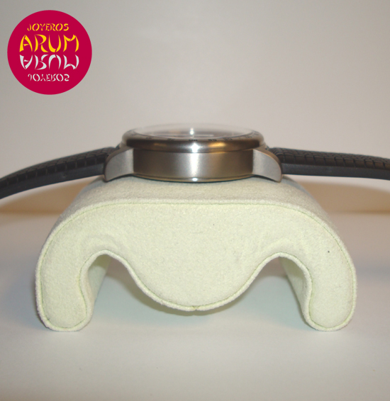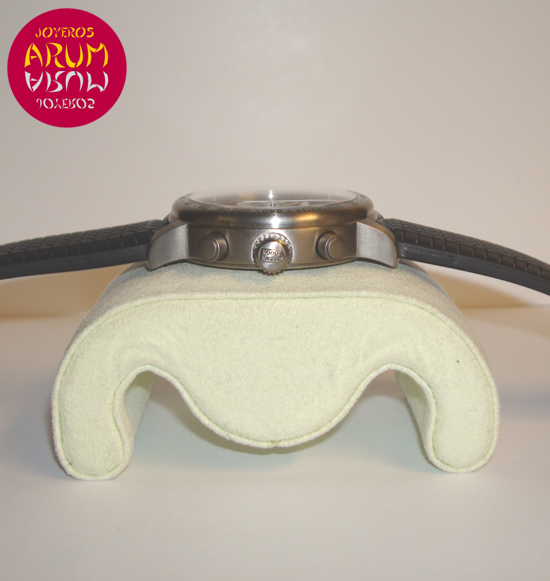 Description :titanium, black dial with arabic numbers, bezel with tachymeter scale, antireflective sapphire crystal, automatic movement, power reserve 40 hours, chronograph, three indicators on the dial, seconds, minutes, hours, date between four and five, luminescent dial and handles, transparent back, crown and two buttons at right, diameter 40 mm, waterproof 50 meters, rubber strap, buckle closure, year 2005.