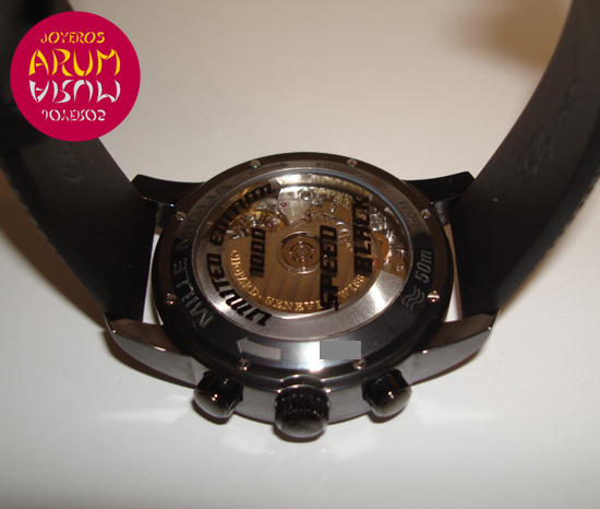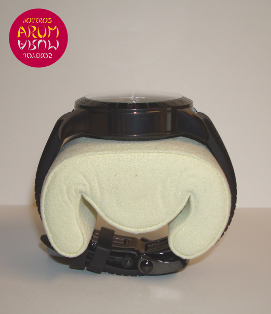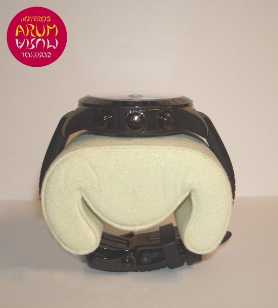 Description :limited edition of 1000 pieces, steel, black dial, sapphire crystal, automatic movement, power reserve 48 hours, bezel with 24 hour time scale, chronograph, three indicators on the dial, seconds, minutes, hours, date with magnifying glass at three, GMT function, (second time zone indicated by auxiliary handle), luminescent handles, screw crown and two buttons, diameter 42.5 mm, waterproof 50 meters, transparent case back, rubber strap, folding clasp, year 2011.