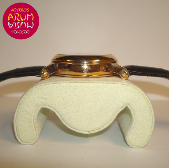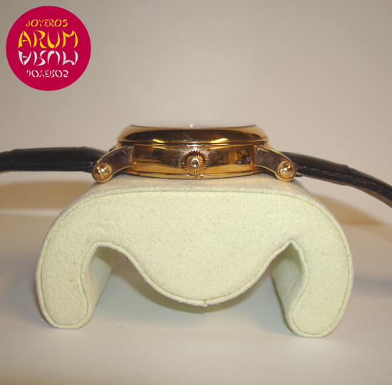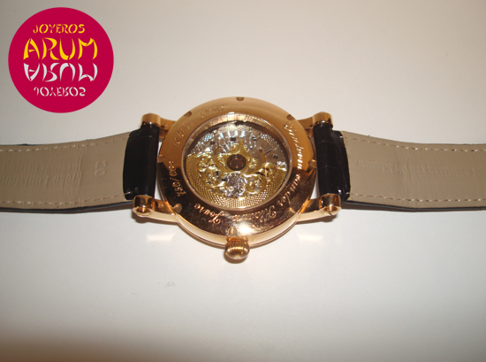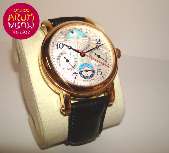 Description :pink gold, white dial, smooth bezel, antireflective sapphire crystal, blued steel hands, central seconds, automatic movement, hours, minutes, seconds, date and month indicator, shows the position of the moon in relation to the sun, separate hand at nine indicate the eclipse of the sun and the eclipse of the moon, right rown, transparent back, diameter 40 mm, black leather original strap, rose gold buckle closure.