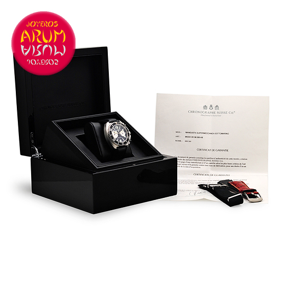 Other specifications :caliber 26, rotating bezel, chronograph, small seconds at thee, minute indicator at nine, luminous, screw crown. Warranty without date. With 2 additional straps.