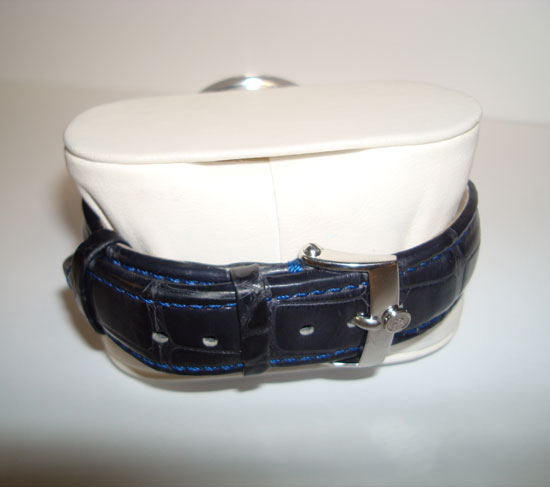 Description :steel, sapphire crystal, silver sphere, blue steel hands, automatic movement, 4 indicators on the dial, small seconds, date, chronograph, transparent back cover, diameter 37 mm, screw crown and two buttons, blue leather strap, steel buckle closure.