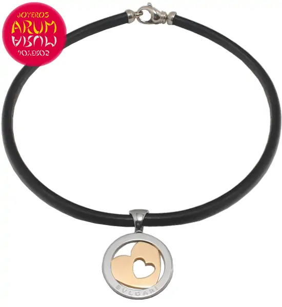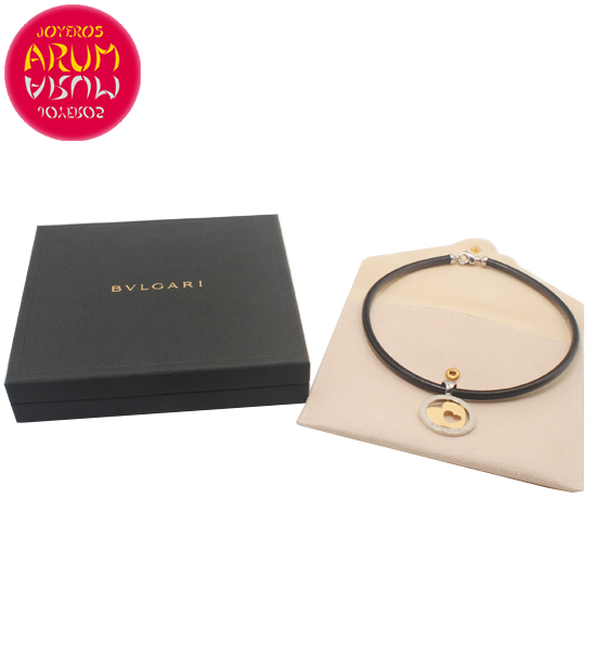 Description: Bulgari pendant made in 18K yellow gold and steel with black leather chain. Diameter is 3 cm.
