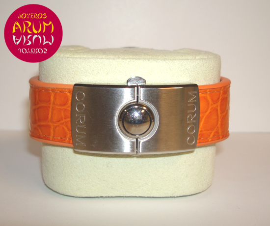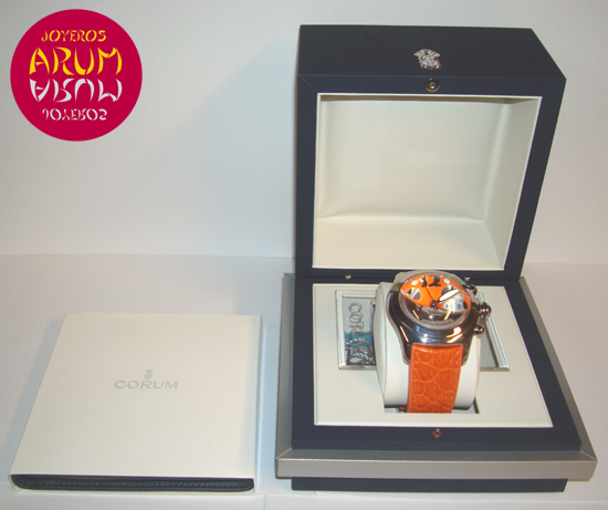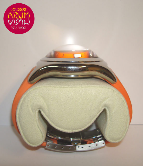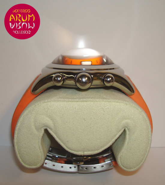 Description :steel, orange dial, smooth bezel, domed sapphire crystal, quartz movement, handles and dial with luminescent indicators, chronograph, three indicators on the dial, seconds, minutes, hours, date at six, screw crown and two buttons at right , diameter 45 mm, waterproof 200 meters, orange leather strap, folding clasp.