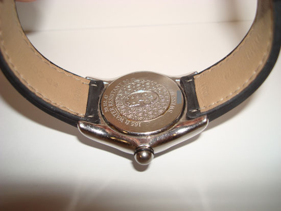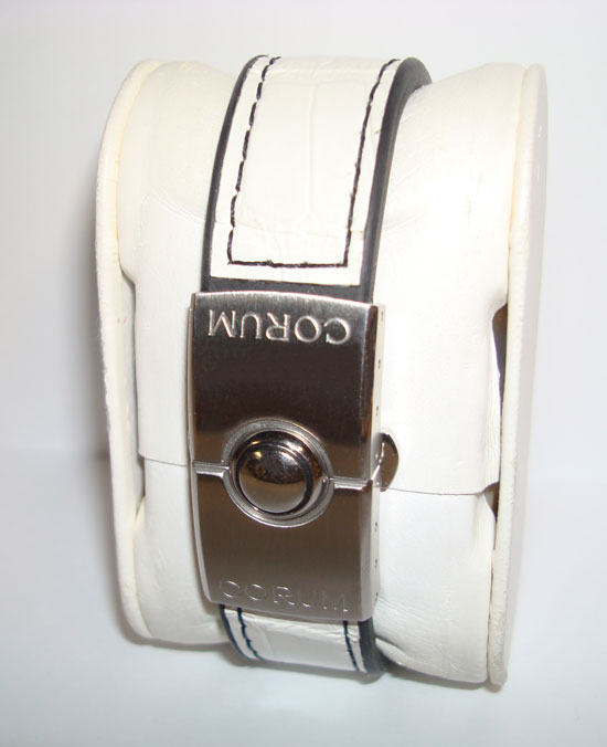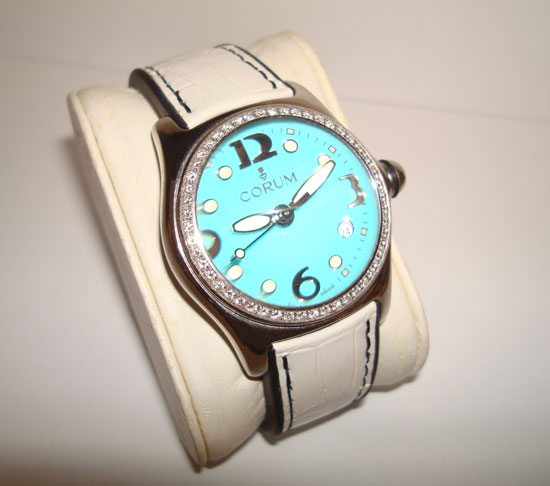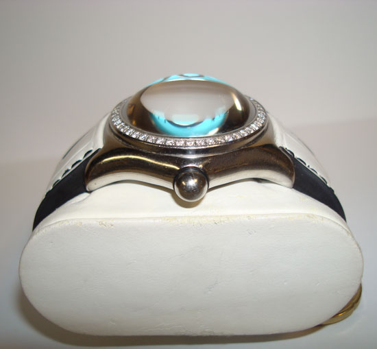 Description :lady’s watch, steel, domed sapphire crystal, diamonds on the bezel, quartz movement, blue dial, date at four o’clock, center seconds, luminescent handles and dial, screw crown, diameter 35 mm, 50 meters underwater, white leather strap , steel folding clasp.