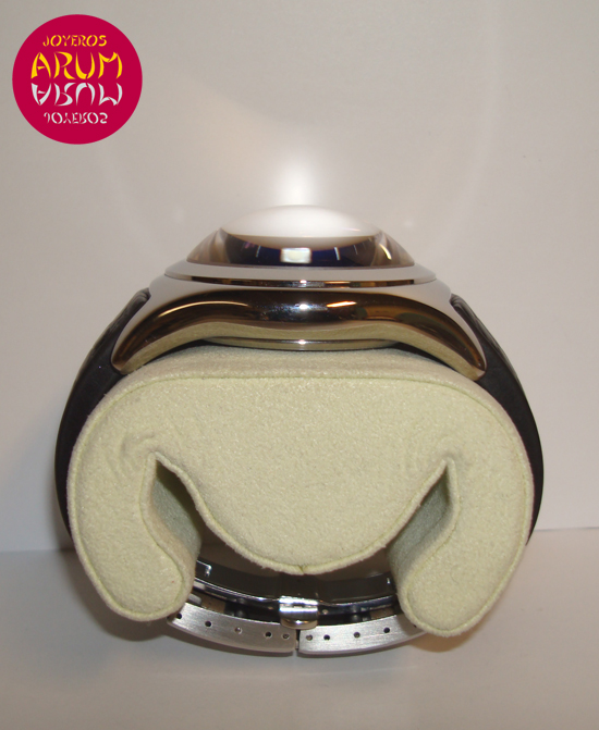 Description :steel, blue dial with arabic numerals, domed sapphire crystal, quartz movement, date at six, center seconds, handles and luminescent dial, waterproof 200 meters, diameter 45 mm, black leather strap, folding clasp in steel.