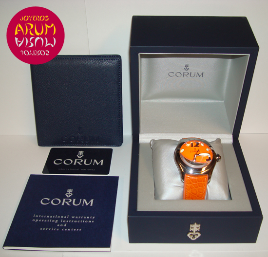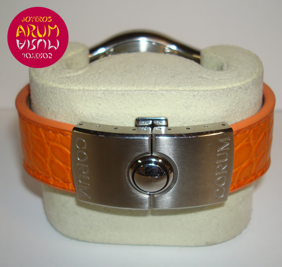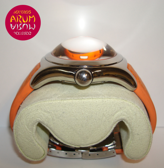 Description :steel, orange sphere with arabic numerals, domed sapphire crystal, quartz movement, date at six o’clock, center seconds, handles and luminescent dial, waterproof 200 meters, diameter 45 mm, orange leather strap, folding clasp in steel, year 2011.
