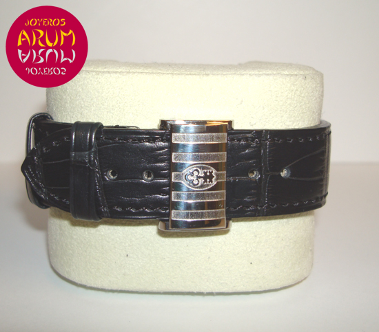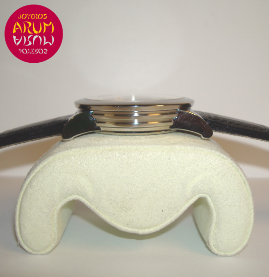 Description :steel, white dial, smooth bezel, sapphire crystal, automatic movement, power reserve indicator at six, date with magnifying glass at twelve, luminescent handles, right crown, transparent back, diameter 42 mm, waterproof 100 meters, black leather strap, folding clasp in steel.