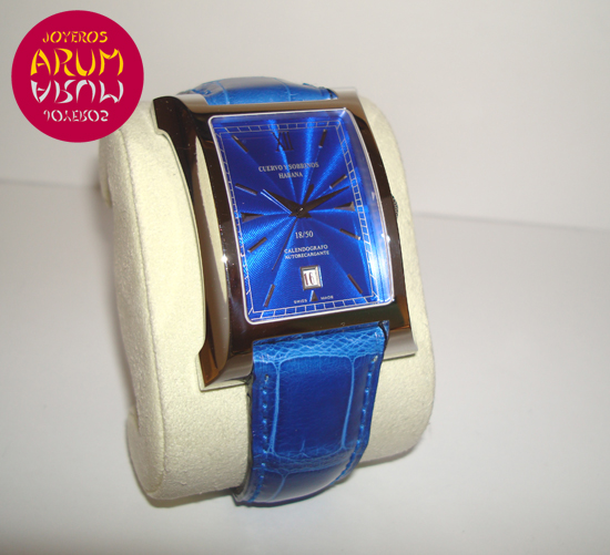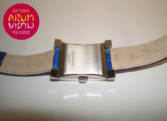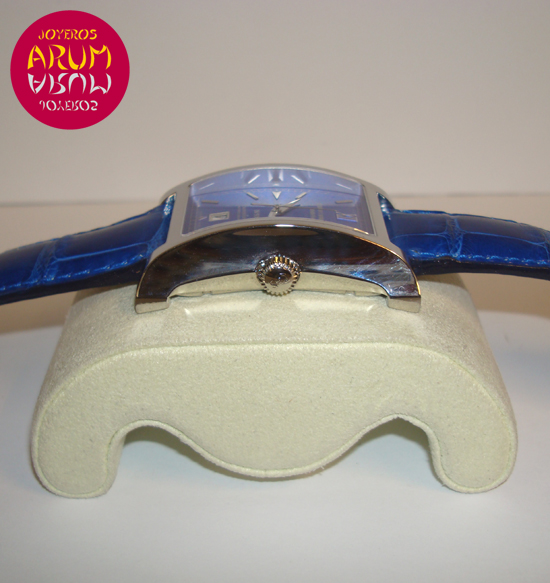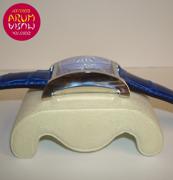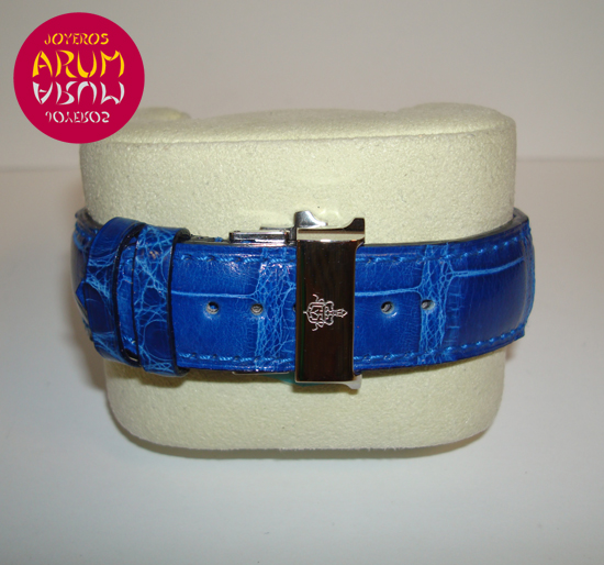 Description :steel, blue guilloche dial, sapphire crystal, automatic movement, central second, date at six, screw crown, diameter 32 mm by 47 mm, blue leather strap, folding clasp in steel.