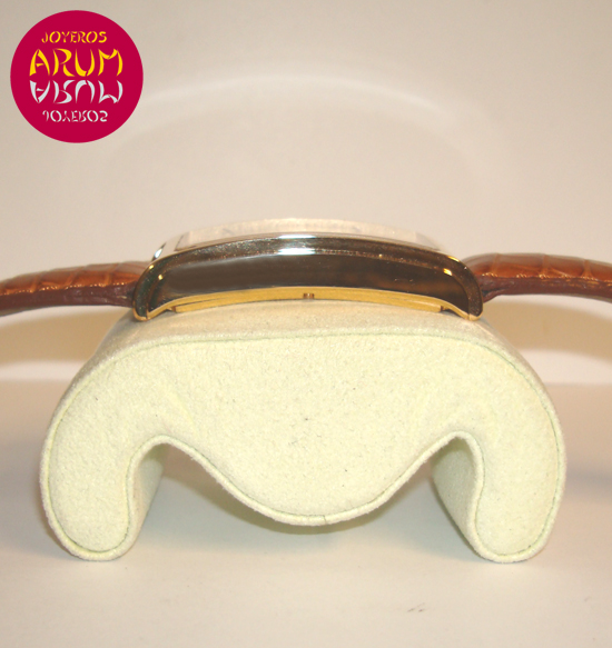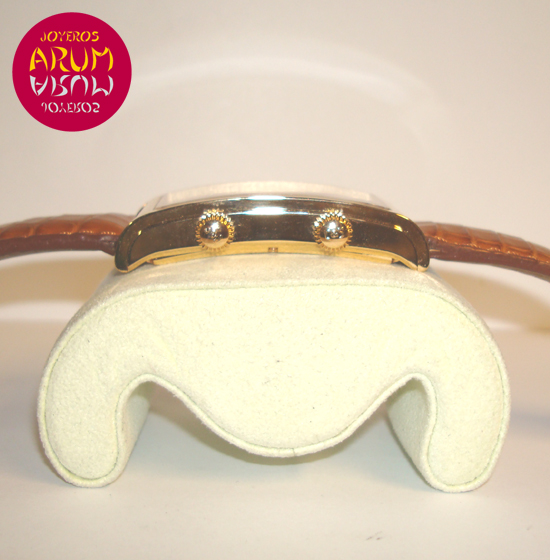 Description :yellow gold, white dial, smooth bezel, sapphire crystal, automatic movement, dual time, diameter 30.5 mm by 52 mm, waterproof 30 meters, two crowns at right, brown leather strap, buckle closure.
