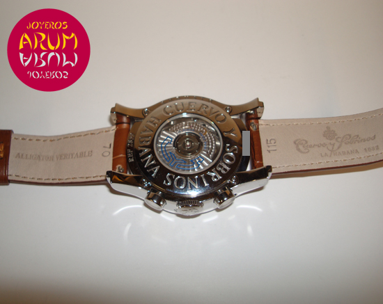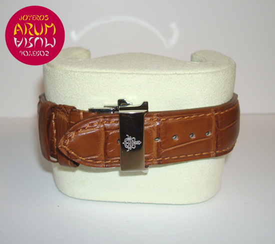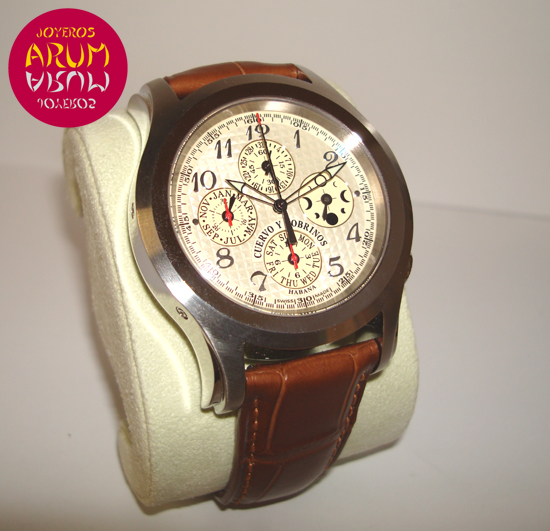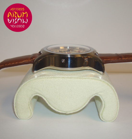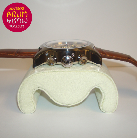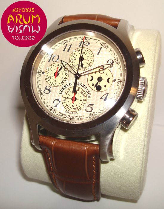 Description :steel, sphere champagne (pyramids decorated with embossed effect), sapphire crystal, automatic movement, fixed bezel, luminescent indicators handles, chronograph, display of seconds, minutes and hours, date at twelve, day of the week at six, month at nine, moon phase at the three, crown and two buttons at right, diameter 43 mm, waterproof 30 meters, transparent case back, brown leather strap, steel folding clasp.
