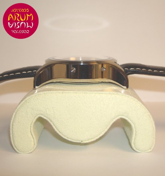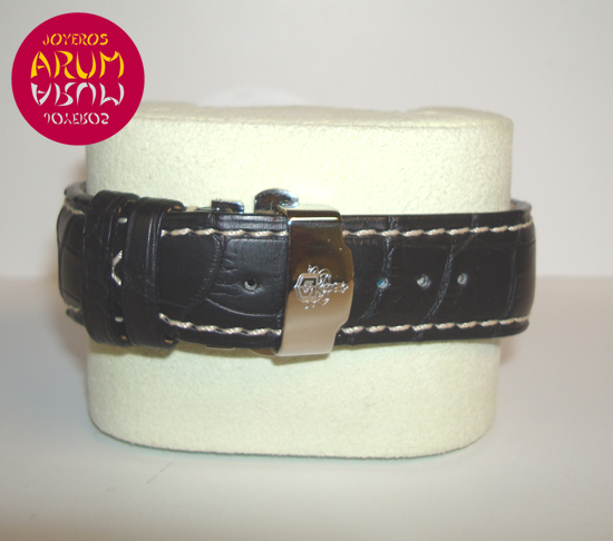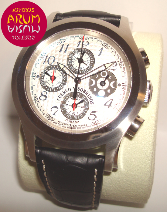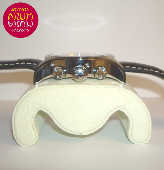 Description :steel, silver dial (pyramids decorated with embossed effect), sapphire crystal, automatic movement, fixed bezel, luminescent indicators handles, chronograph, display of seconds, minutes and hours, date at twelve, day of the week at six, month at nine, moon phase at the three, crown and two buttons at right, diameter 43 mm, waterproof 30 meters, transparent case back, black leather strap, steel folding clasp.