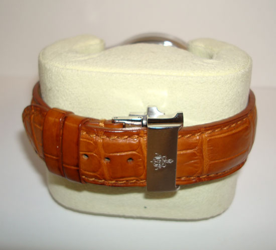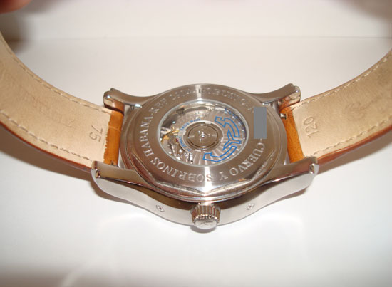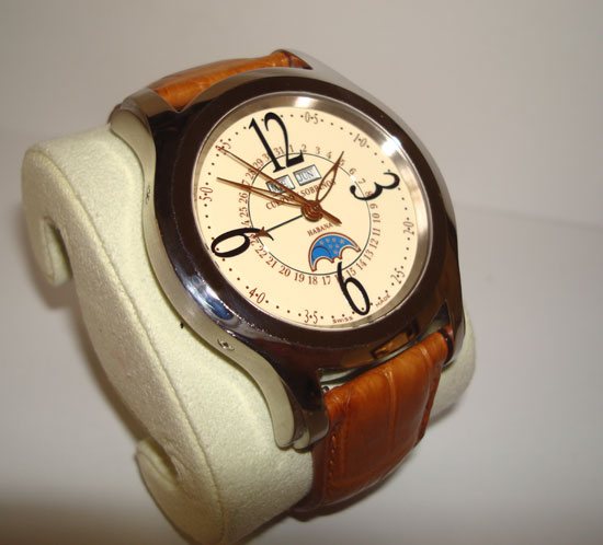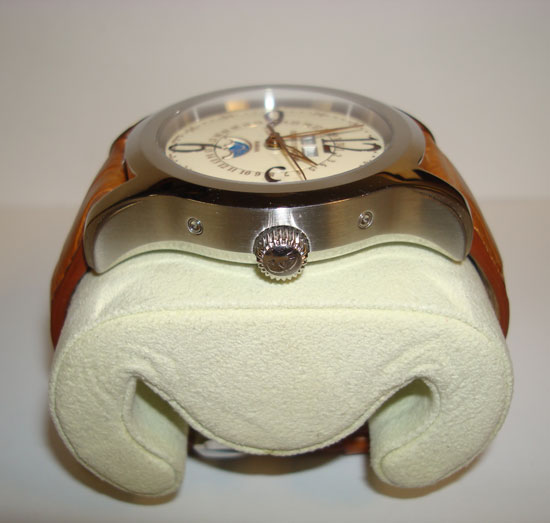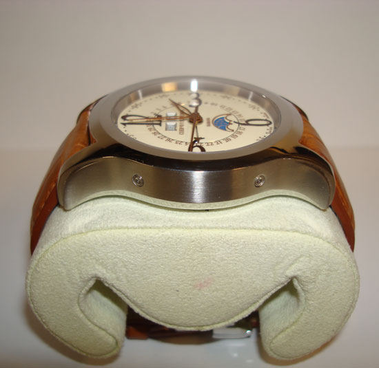Description :steel, cream dial, sapphire crystal, automatic movement, central second, interior handle that indicates the date, day of week and month, moon phase, screw crown, transparent caseback, 43 mm diameter, 50 meters underwater , brown leather strap, steel folding clasp, year 2010.