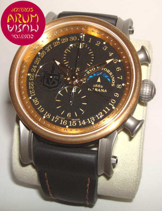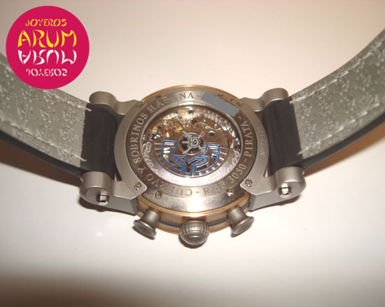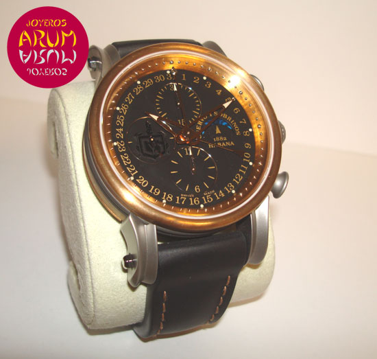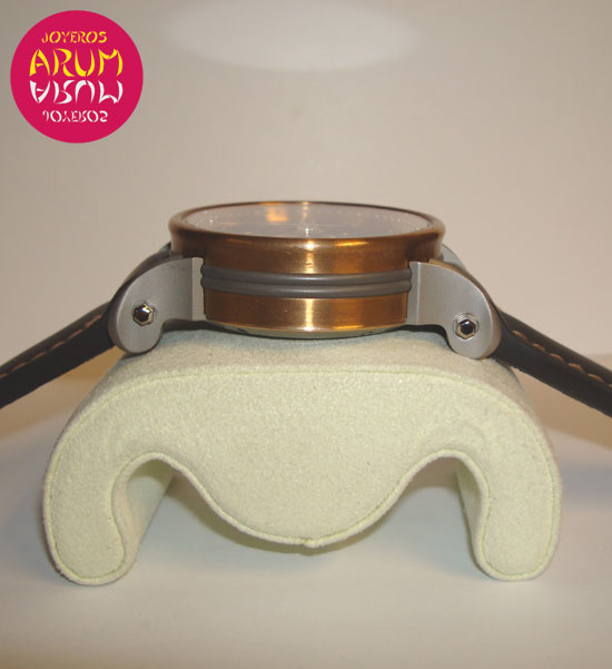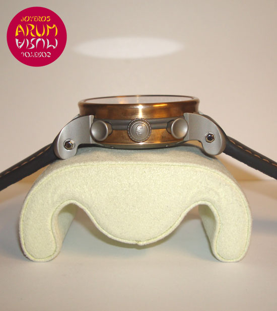 Description :limited to 125 pieces, bronze and titanium, black dial, sapphire crystal, automatic movement, chronograph, display of seconds, minutes and hours, central handle that indicates the date, moon phases at three, handles with luminescent indicators, reserve 42 hour, screw crown and pushers at right, transparent back, diameter 45 mm, waterproof 50 meters, black leather strap, buckle closure, year 2008.
