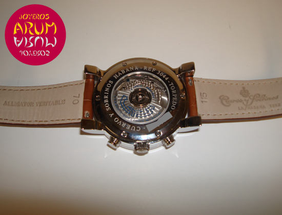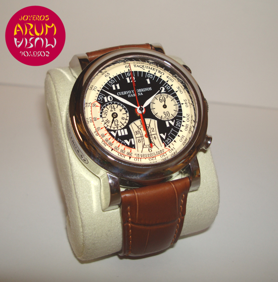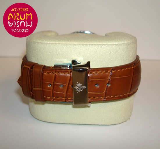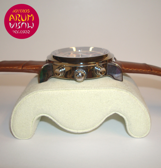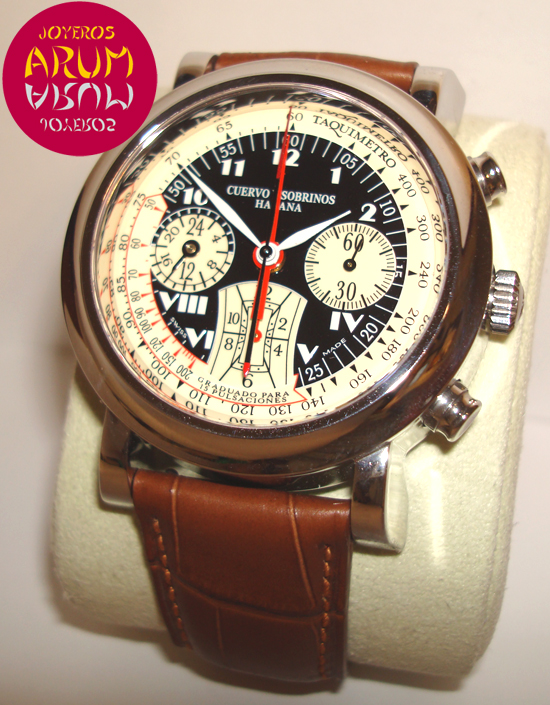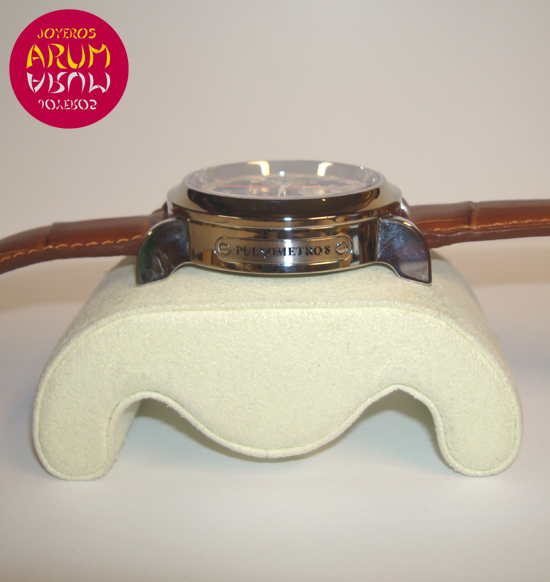 Description :steel, black dial and cream, sapphire crystal, automatic movement, chronograph, three indicators on the dial, seconds, minutes and hours, taquimeter, pulsometer, two push buttons and screw crown, diameter 43 mm, transparent caseback, brown leather strap , steel folding clasp.