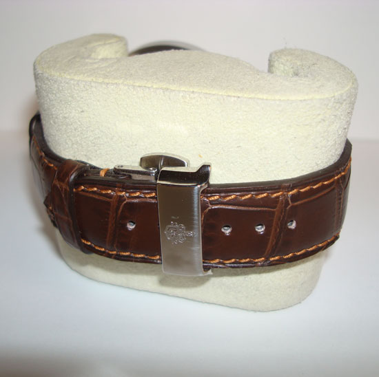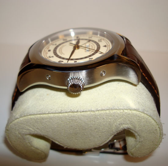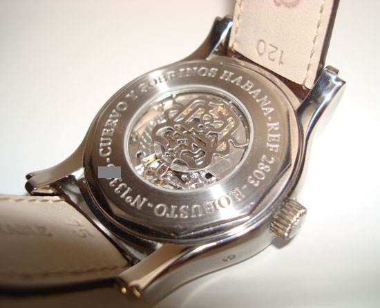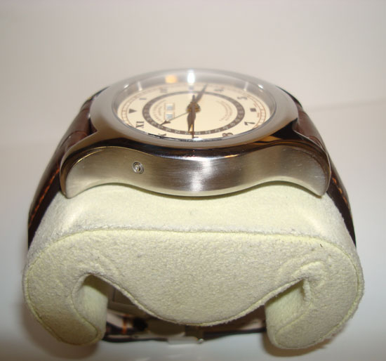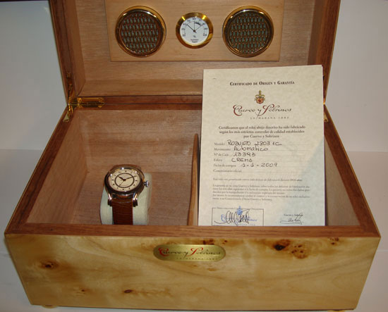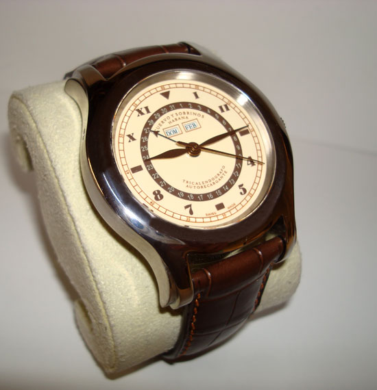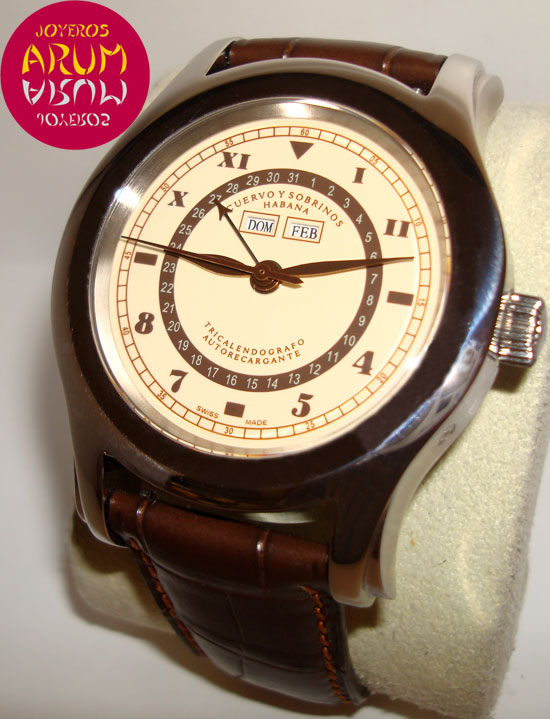 Description :steel, sphere cream, sapphire crystal indicator, day of week and month with letters, and indicato numbered day of the month, center seconds, diameter 43 mm, screw crown, brown leather strap, steel folding clasp with anagram of Cuervo y Sobrinos.