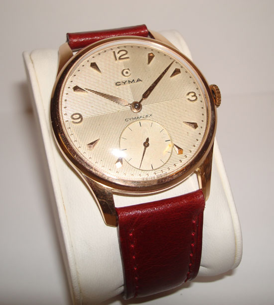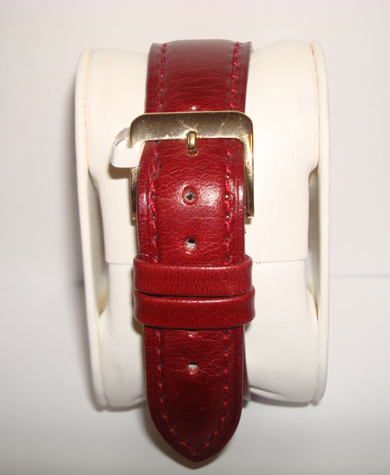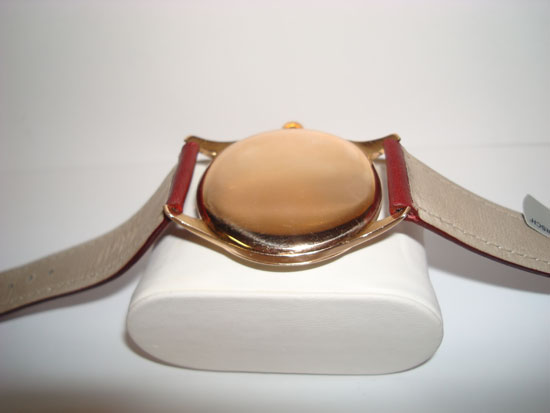 Description :yellow gold, glass plastic, automatic movement, small seconds, removable screwed crown, diameter 37 mm, bordeaux leather strap, gold buckle closure.