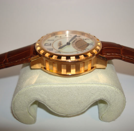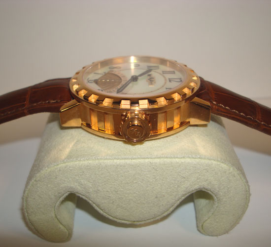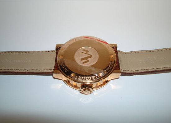 Description :limited edition to 99 pieces, pink gold, sapphire crystal, mother of pearl dial with arabic numerals, automatic movement, retrograde seconds (the handles returns to the starting position to begin a new count of 30 seconds), screw crown, diameter 43 mm, brown leather strap, pink gold buckle closure.