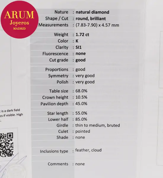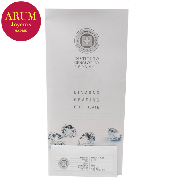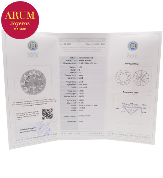 Product: Diamond for Investment 1,72 cts.Shop Reference: RAJ2196Cut: Round BrilliantWeight: 1.72 ct.Colour: KClarity: SI1Certificated by Spanish Gemological Institute.