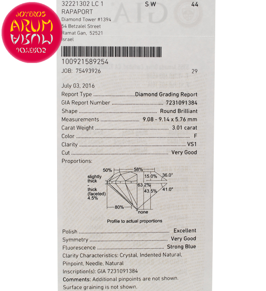 Product: Diamond for investment 3,01 cts.Shop Reference: RAJ1271Cut: Round BrilliantWeight: 3,01 ct.Colour: FClarity: VS1Certificated by GIA.