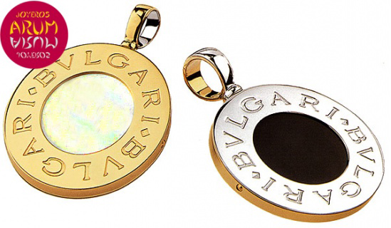 Description: Double face necklace Bulgari, 18K yellow gold and mother of pearl, and on the opposite side steel and onyx. 5 band of leather.