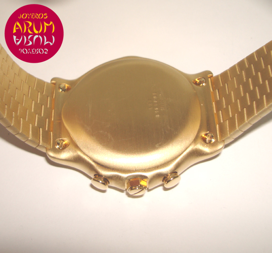 Description :yellow gold, cream dial, sapphire crystal, automatic movement, chronograph, three indicators on the dial, minutes at three, hours at six, small seconds at nine, date between four and five, tachymeter, screw crown and two buttons, diameter 38 mm, waterproof 30 meters, yellow gold strap, hidden folding clasp.