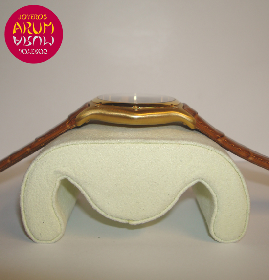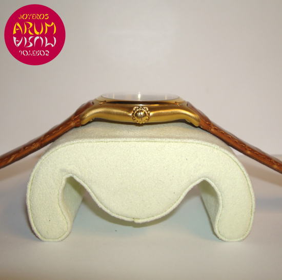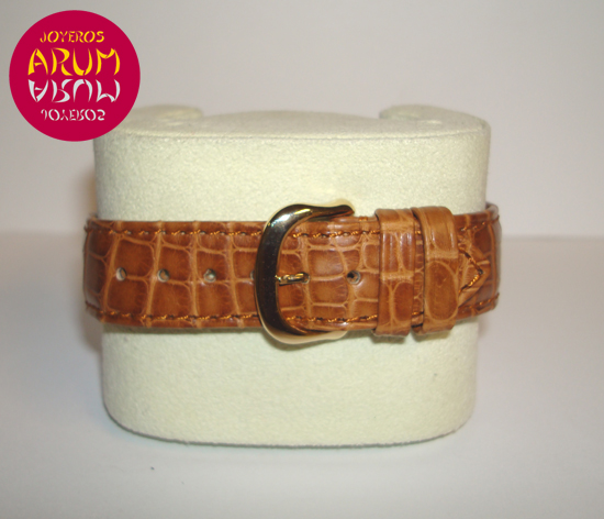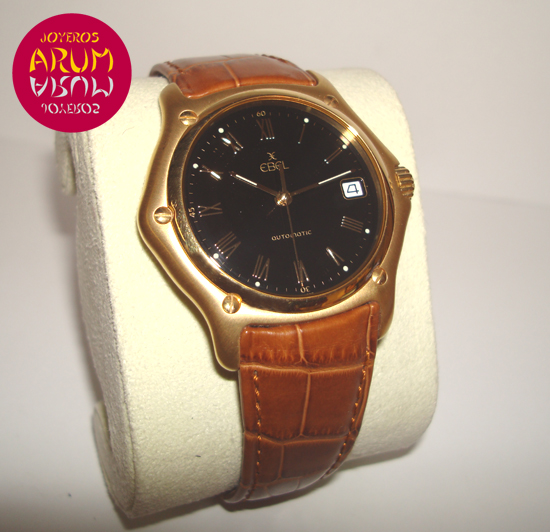 Description :yellow gold, black dial with roman numbers, sapphire crystal, automatic movement, center seconds, luminescent handles with indicators, date at three, screwed crown, diameter 40 mm, brown leather strap, buckle closure.