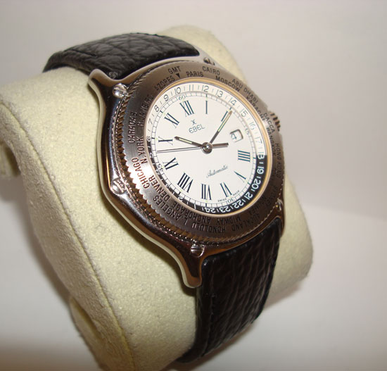 Description :steel, rotating bezel world time, sapphire crystal, white dial with roman numerals, GMT, automatic movement, screw crown, diameter 38 mm, waterproof 30 meters, black leather strap, steel folding clasp.