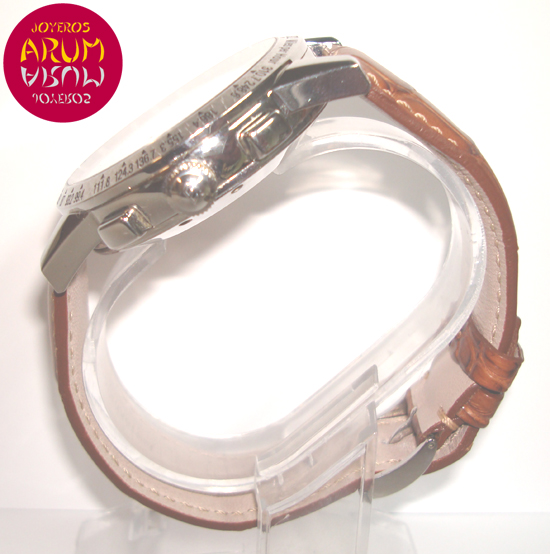 Description :steel, black dial, sapphire crystal, automatic movement, chronograph, minute indicator at twelve, hour indicator at six, handles and luminescent numbers, screw crown and two buttons, diameter 43 mm, waterproof 30 meters, leather strap brown, buckle closure, year 2002.