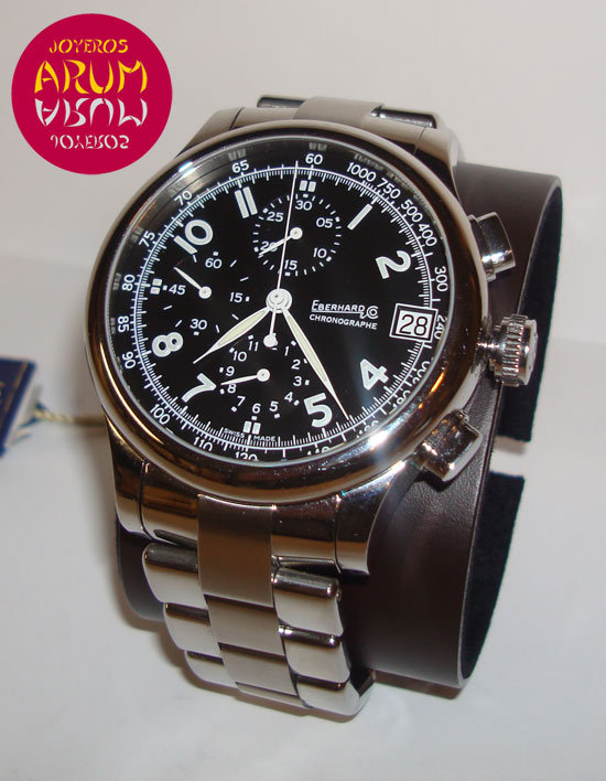Description :black dial, steel, sapphire crystal, arabic numerals, chronograph, hours, minutes, seconds, date, automatic, 42 mm diameter, screw crown and two buttons, transparent cap, belt steel, folding closure.