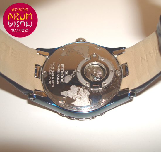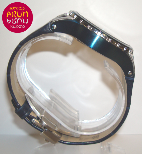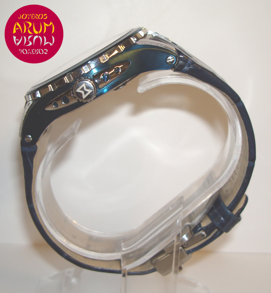 Description :PVD steel, blue dial, fixed smooth bezel, sapphire crystal, automatic movement, power reserve of 42 hours, center seconds, window display at twelve, screw crown, diameter 40 mm, waterproof 100 meters, blue leather strap, year 2010.