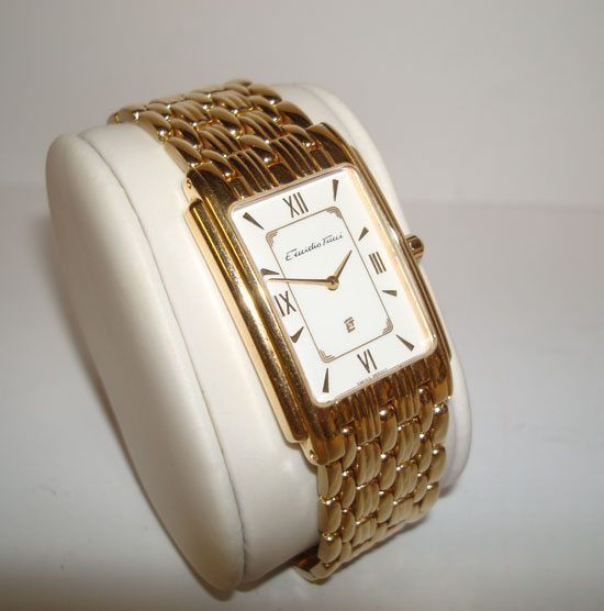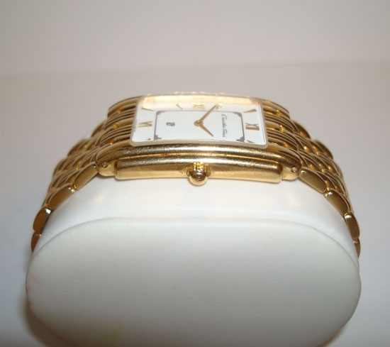 Description :yellow gold, white dial, sapphire crystal, quartz movement, screw crown, waterproof 30 meters, diameter 23.5 mm, yellow gold strap, hidden folding clasp.