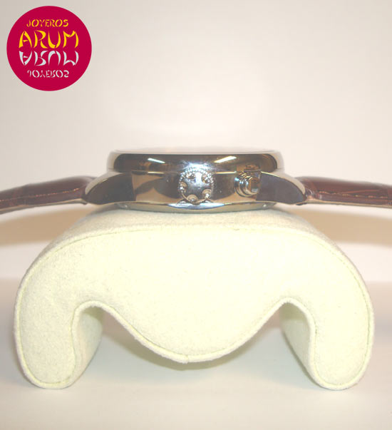 Description :steel, silver dial, smooth bezel, sapphire crystal, automatic movement, caliber ETA Valjoux 7751, chronograph, annual calendar, month indicator and day of the week at twelve, date with central handle, moon phase at six, 24 hours function, handles with luminescent indicators, crown at right, diameter 42 mm, waterproof 50 meters, brown leather strap, folding clasp.