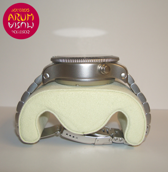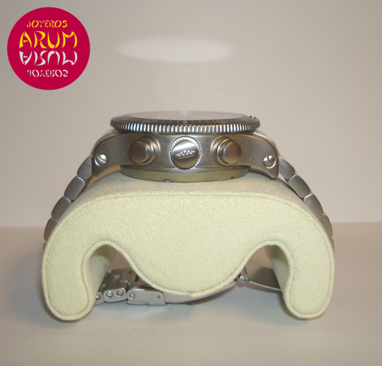 Description :brushed steel, black dial, rotating bezel, sapphire crystal, automatic movement, chronograph, three indicators on the dial, seconds, minutes and hours, GMT function (second time zone), alarm, date at three, handles and luminescent numbers, crown and two buttons at right, left auxiliary button, diameter 44 mm, waterproof 200 meters, brushed steel bracelet, folding clasp, year 2010.