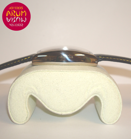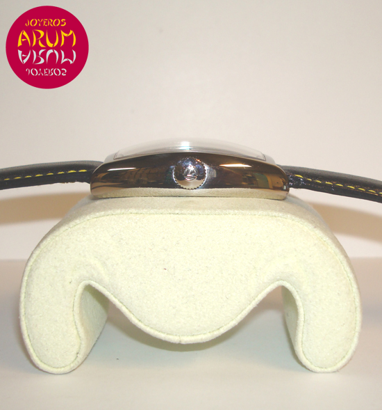 Description :steel, black dial with arabic numbers, smooth bezel, sapphire crystal, automatic movement, blued steel hands, center seconds, luminescent handles and dial, screw crown, diameter 32 by 45 mm, black leather strap, steel buckle closure, year 2003.