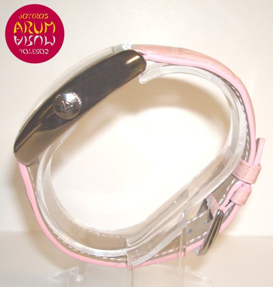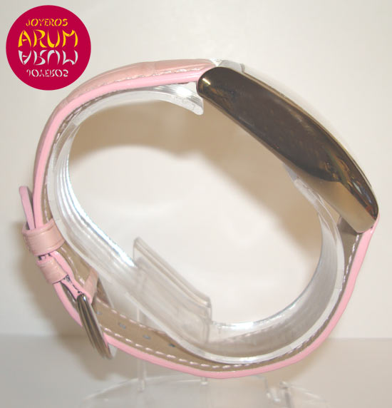 Description :steel, black dial with arabic numbers, smooth bezel, sapphire crystal, automatic movement, center seconds, blued steel hands, luminescent indicators, screw crown, diameter 32 mm by 45 mm, waterproof 30 meters, pink leather strap, buckle closure .