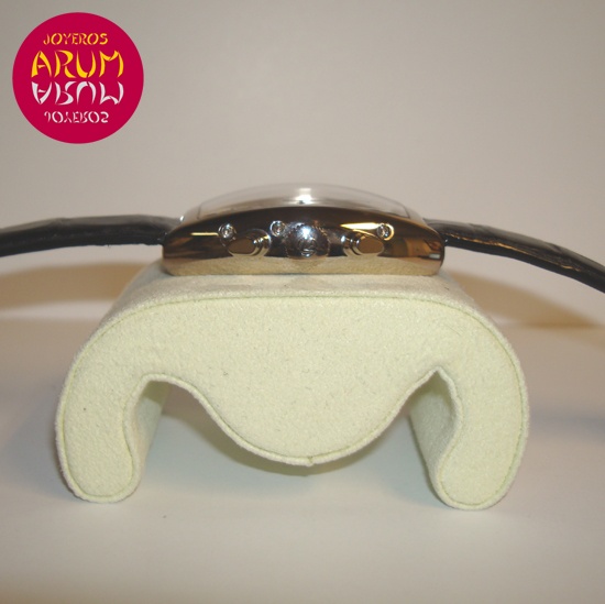 Description :limited edition, white gold, silver guilloche dial, smooth bezel, sapphire crystal, blued steel hands, automatic movement, chronograph, moon phase, perpetual calendar, date, day of week, retrograde month indicator, years, screw crown and two buttons at right, diameter 34 mm by 47 mm, original strap black alligator, original buckle closure.